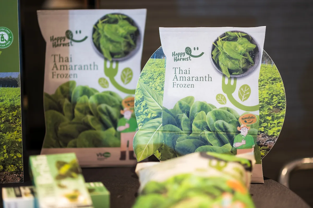 We focus on regenerative farming, circular packaging, and zero-waste systems. Through Happy Harvest, Thai Amaranth is grown with lower water use, fast cycles, and soil enrichment practices. In packaging, we partner with SCGP and FEST to reduce plastic by 90% using plant-pulp trays that decompose in 60 days.